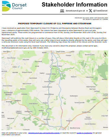 Dorset Council have received an application from Openreach to close C13, Pimperne and Stourpaine between Bushes Road and Smugglers Lane, a distance of approximately 2350 metres. The closure has been requested to allow Openreach to carry out pole replacement works. These works are programmed to commence from 07:00, Sunday 2nd November 2025 until 12:00, Sunday 2nd November 2025.
