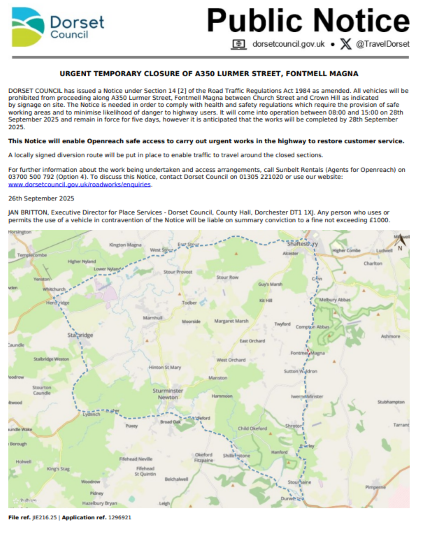 URGENT TEMPORARY CLOSURE OF A350 LURMER STREET, FONTMELL MAGNA